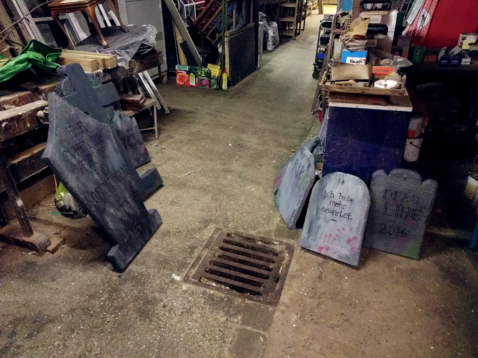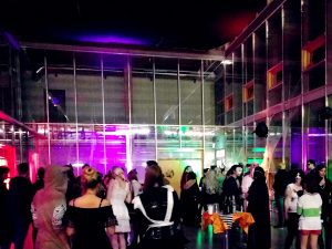 Für die passende Atmosphäre sorgte unsere fleißig im Vorfeld vorbereitete und großteils selbstgebastelte Deko – besonders unsere Grabsteine mit studiengangspassenden Inschriften à la „Ich habe mehr erwartet“ oder „Error 404“ wurden lachend entdeckt und gelobt. Mit gemütlichen Sofas und Stehtischen wurde zwischen Bar und Buffet Raum zum Essen und Unterhalten gegeben – natürlich war es durch unsere großzügig gespannten Spinnennetze, Vogelscheuchen oder Fake-Augäpfel trotzdem immer schön spooky. Nahtlos ging es dann über zum beleuchteten Dancefloor mit DJ-Pult und gleich nebenan im Hörsaal konnte man sich Ausruhen, Zurücklehnen und Horrorfilme schauen.