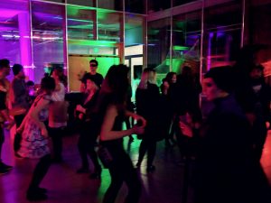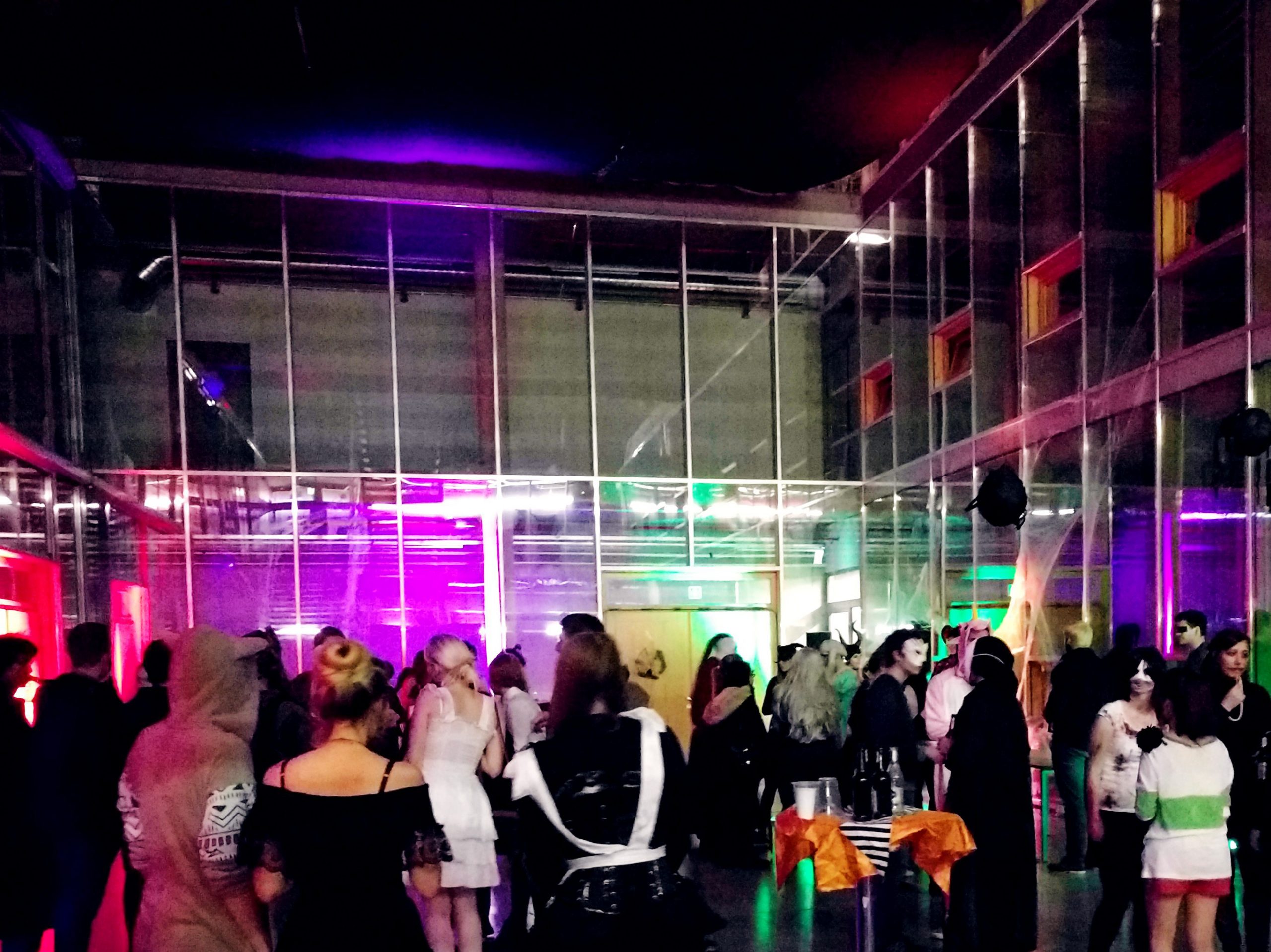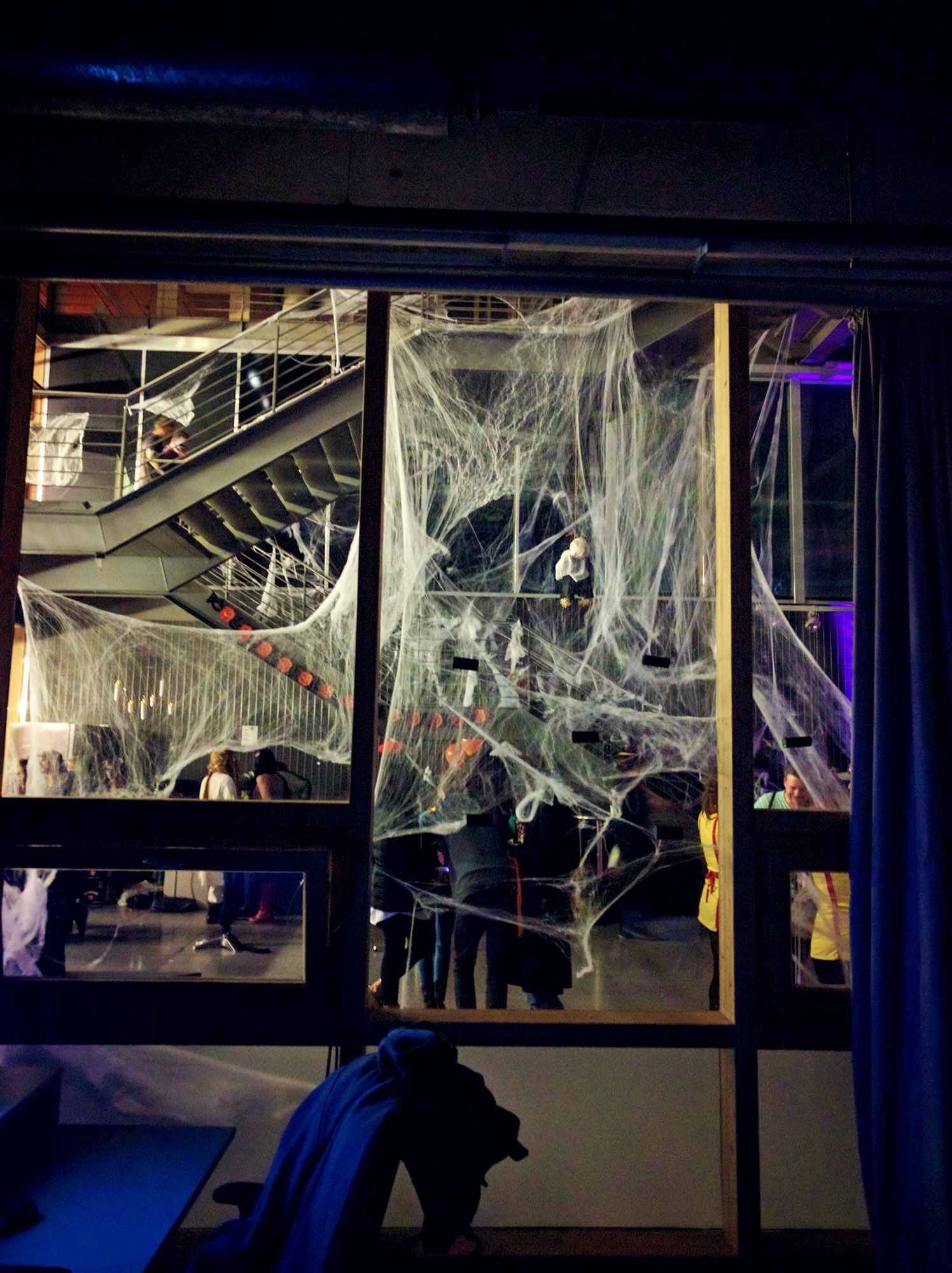 Um 20Uhr ging es los und nach und nach füllte sich die Fläche, man begrüßte sich, Getränke gingen über die Theke. Später wurde selbstständig von den Studenten (natürlich 😉 )Bierpong aufgebaut und gespielt. Ein Kostümwettbewerb hatten wir auch eingeplant und die Gewinner durften dann im Anschluss auf die Spinnen-Pinatas einschlagen, die durch den Lichthof pendelten und schwangen.