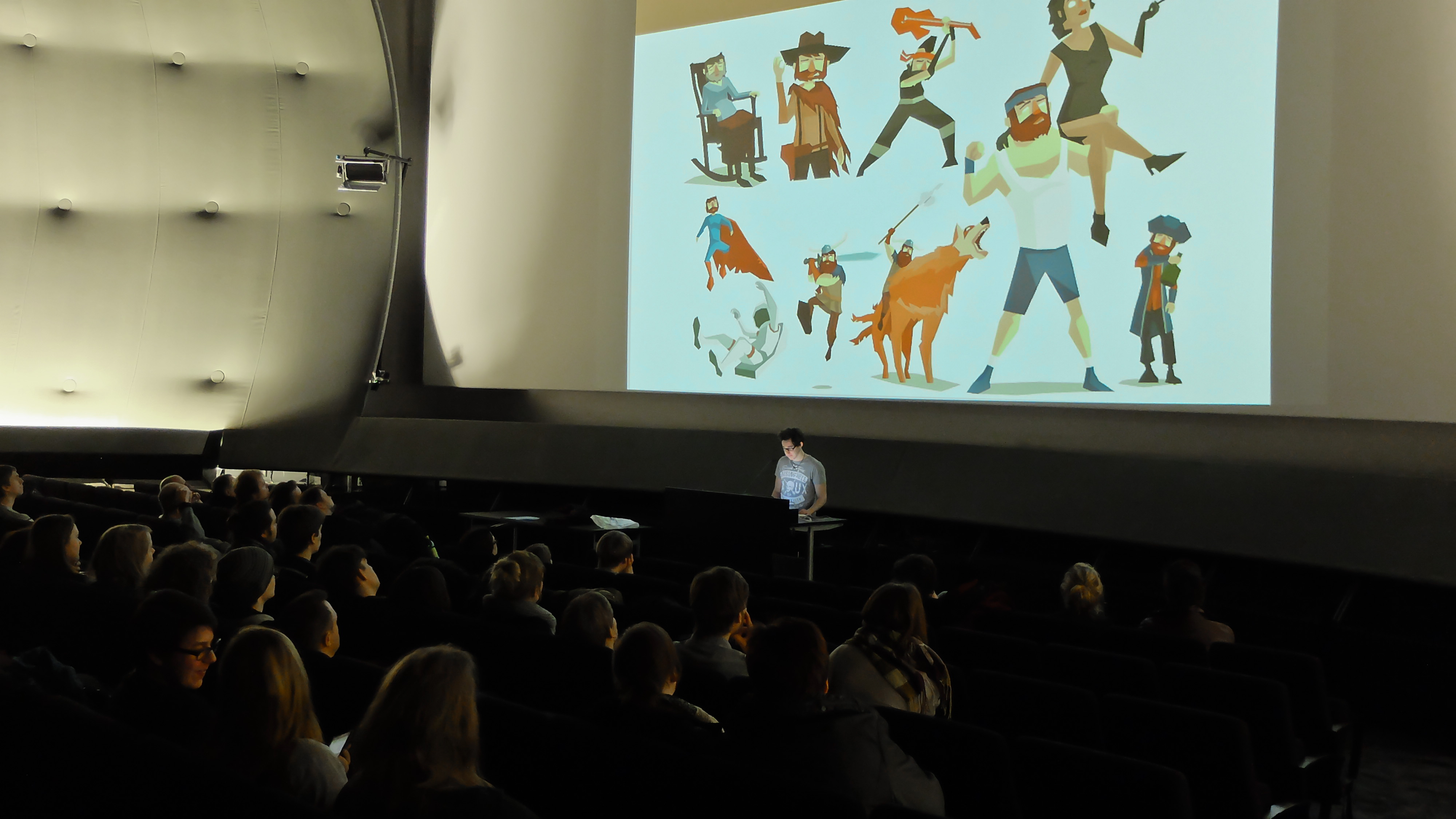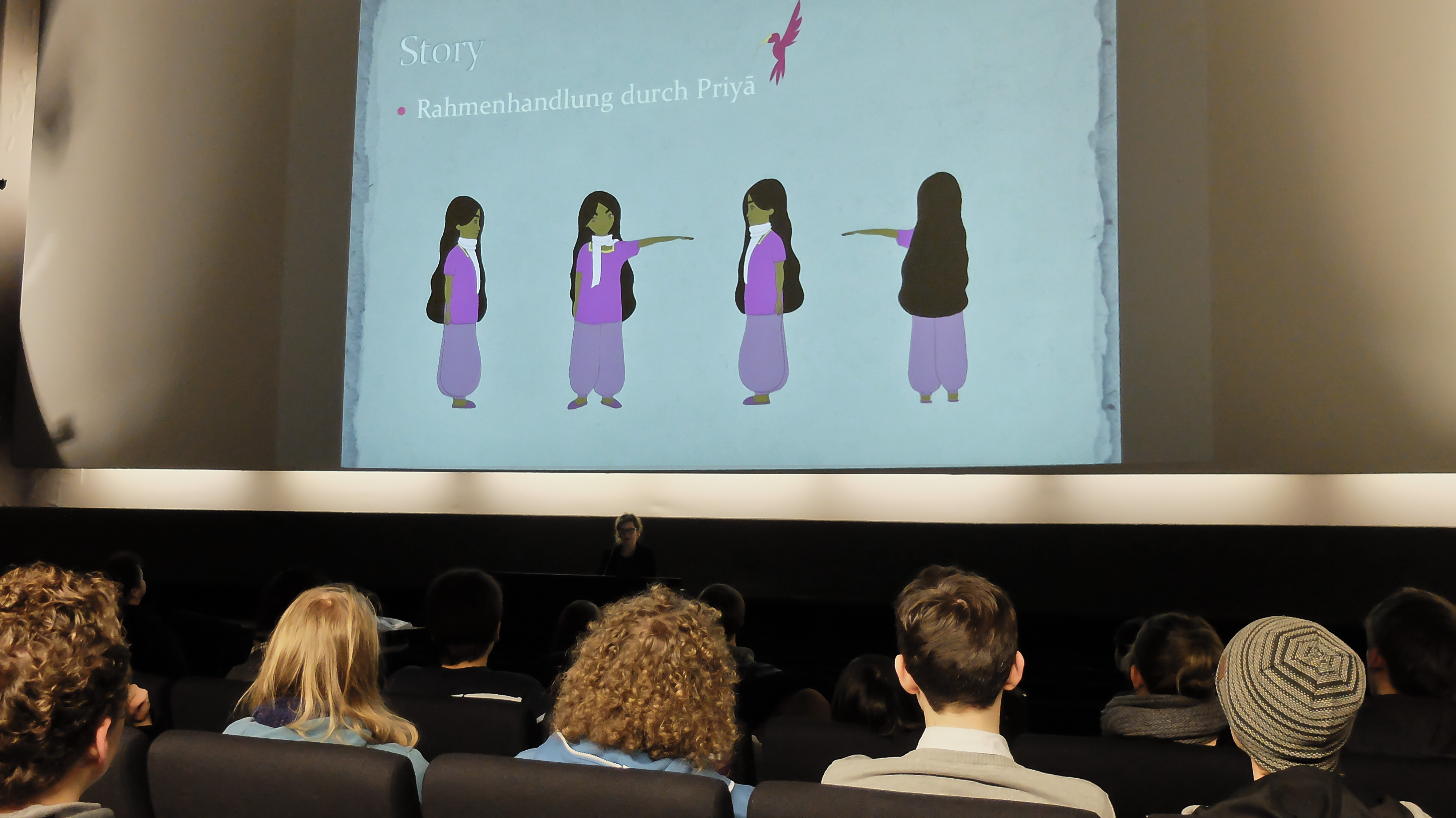 Den Anfang machte Jessica Hauk mit ihrem Projekt „Panchatantra“. Grundlage ihrer Arbeit ist eine altindische Dichtung in fünf Büchern, aus der sie ein Konzept für eine 2D-Animationsserie um ein junges Mädchen namens Priya entwickelte. Am Ende der Präsentation durften sich die Anwesenden über ein Animatic freuen, in welchem die erste Episode „Die Gier“ visualisiert wurde.