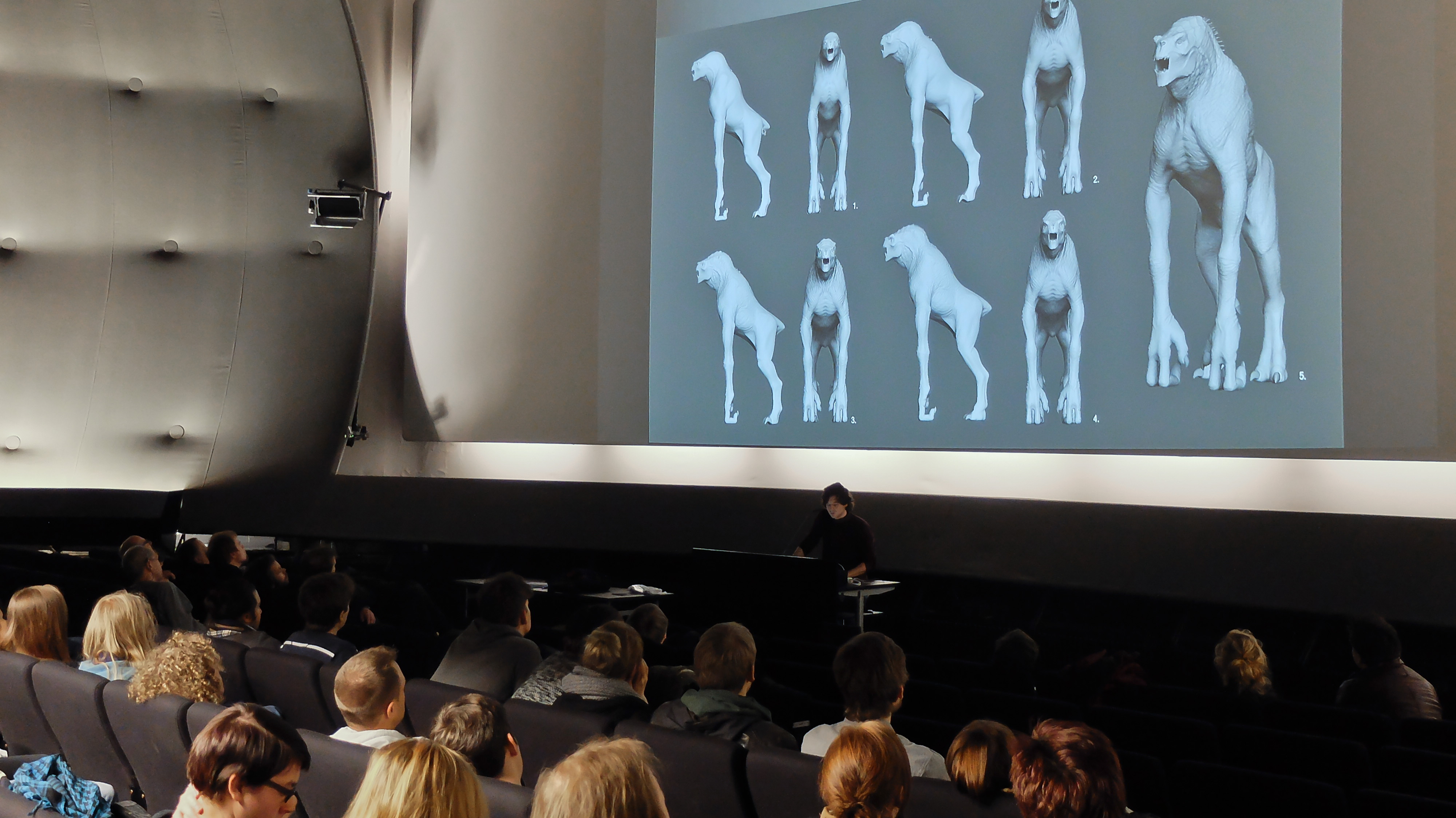 Daniel Weiss machte den Abschluss und präsentierte seine Arbeiten zum Thema Creature Design. Auch hier gab es spannende Einzelheiten über die konzeptionelle Planung und Umsetzung des Characters, sowie viele Zwischenschritte zu sehen. Das realistisch gerenderte Alien wirkte auf der großen Leinwand des Kinosaal umso eindruckvoller.