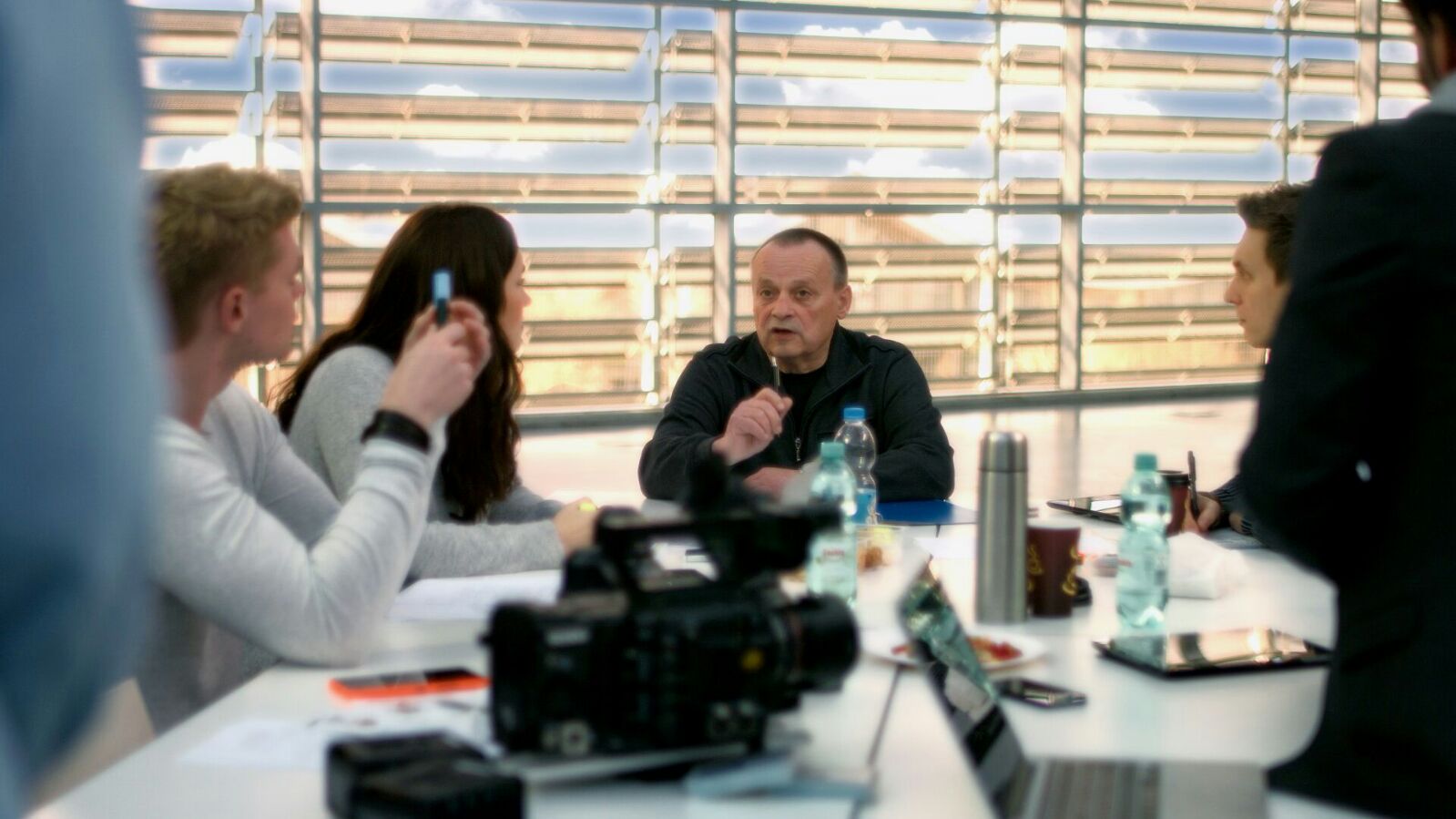 Die Studenten am Set mit den Professoren Michael Mahlstedt, Nils Loof und Markus Fischmann (v.l.n.r.).