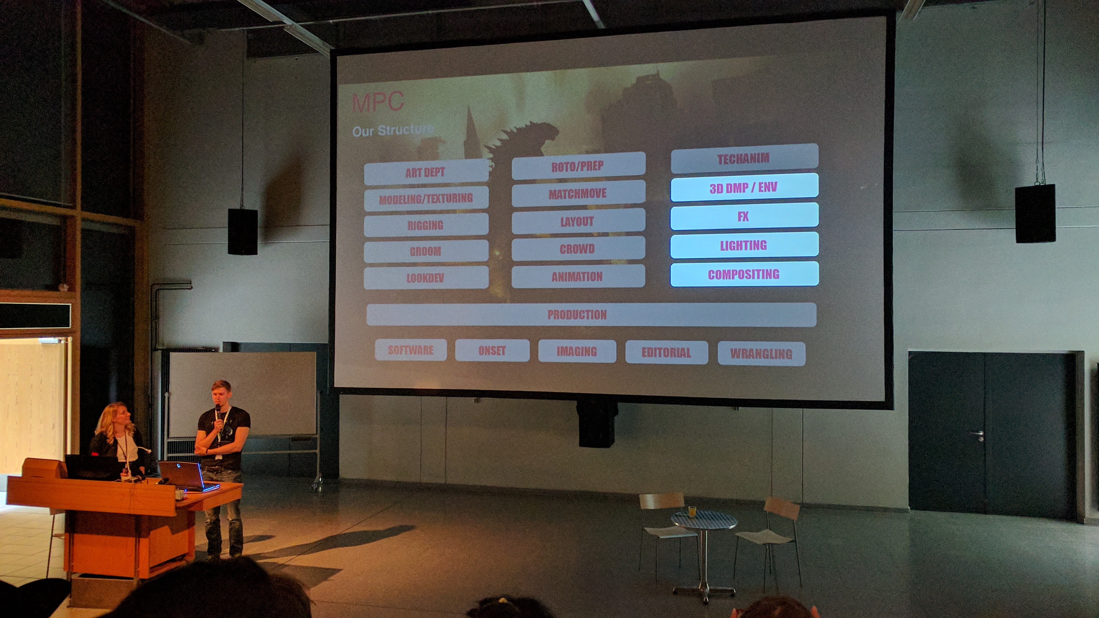 Jasmin Fedder, Tristan Dunse, Sönke Heuer, Kristin Farrensteiner, Jan Schmicker und Manuel Dongowski sind sowohl Konferenzteilnehmer als auch Alumnis des Studiengang Mediendesigns, die bereits ihren Platz in der professionellen Arbeitswelt der Medienbranche gefunden haben. Jasmin und Tristan erzählten von ihrem Leben in Montreal, Kanada, den Menschen, der Stadt, aber auch natürlich der Arbeit und den Ansprüchen und Ausbildungswegen bei den großen Firmen Moving Picture Cinema (MPC) und Cinesite. Sönke und Kristin gaben gemeinsam mit dem Geschäftsführer Henning Westerwelle Einblicke in ihre Arbeiten und Projekte beim Hamburger Unternehmen Infected. Jan schilderte seinen Werdegang von vielen verschiedenen Studios, Galerien und Festivals über die bekannte Animationsfirma Illumination Mac Guff bis zu seinen persönlichen StreetArt-Projekten und gab den Studenten auch einige zwischenmenschliche Tipps mit auf den Weg, um in dieser Branche entspannt und kreativ zu bleiben. Manuel hat gemeinsam mit Rayk Schröder die Firma rise aus Berlin vertreten und über ihre Aufgabengebiete Lighting, Shading und Compositing gesprochen. Dies haben sie anhand ihrer aktuellsten Mitarbeit am Kinofilm „Überflieger – Kleine Vögel, Großes Geklapper“ verbildlicht.