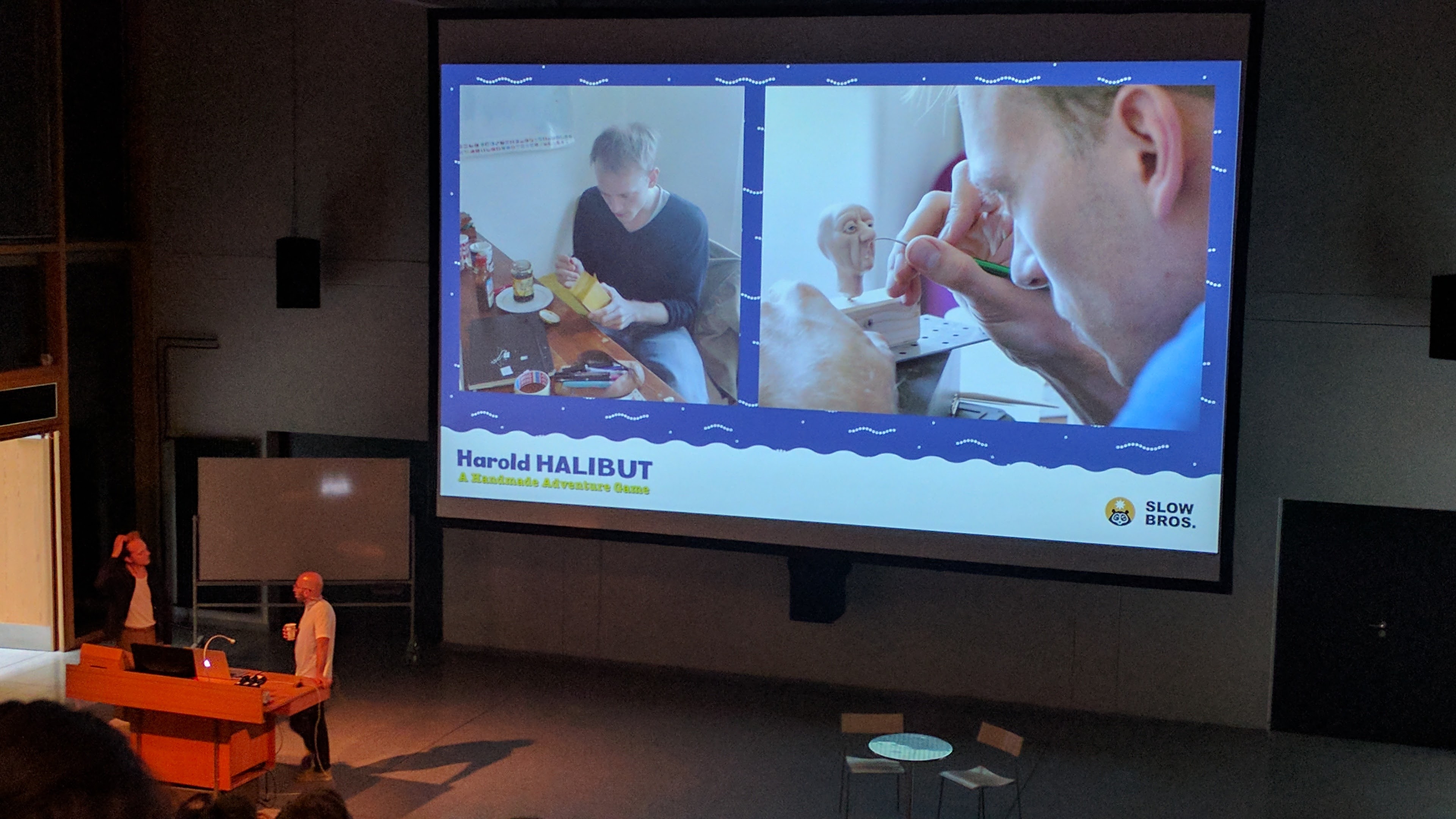 Andere Referenten wie Onat Hekimoglu und Ole Tillmann von den Slow Bros gehörten zu den externen Referenten ohne direkte oder persönliche Verbindung zur Hochschule Hannover, die das Motion Cube – Team für die Konferenz angefragt und eingeladen hat. Das kleine, eigenständige Gamestudio erzählte von ihrem Spiel Harold Halibut, welches analog handgefertigt und dann ins Digitale übersetzt wird.